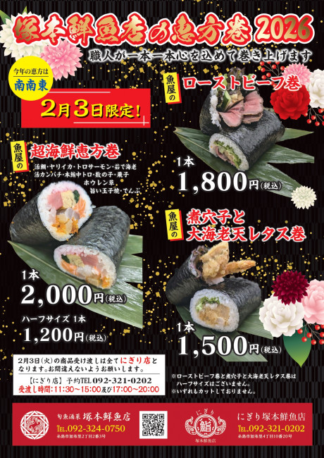 さて、塚本鮮魚店では毎年恒例の恵方巻の販売を今年も行います!